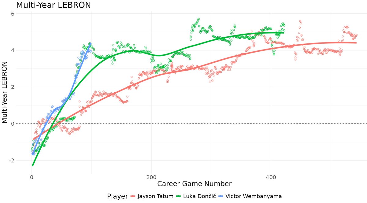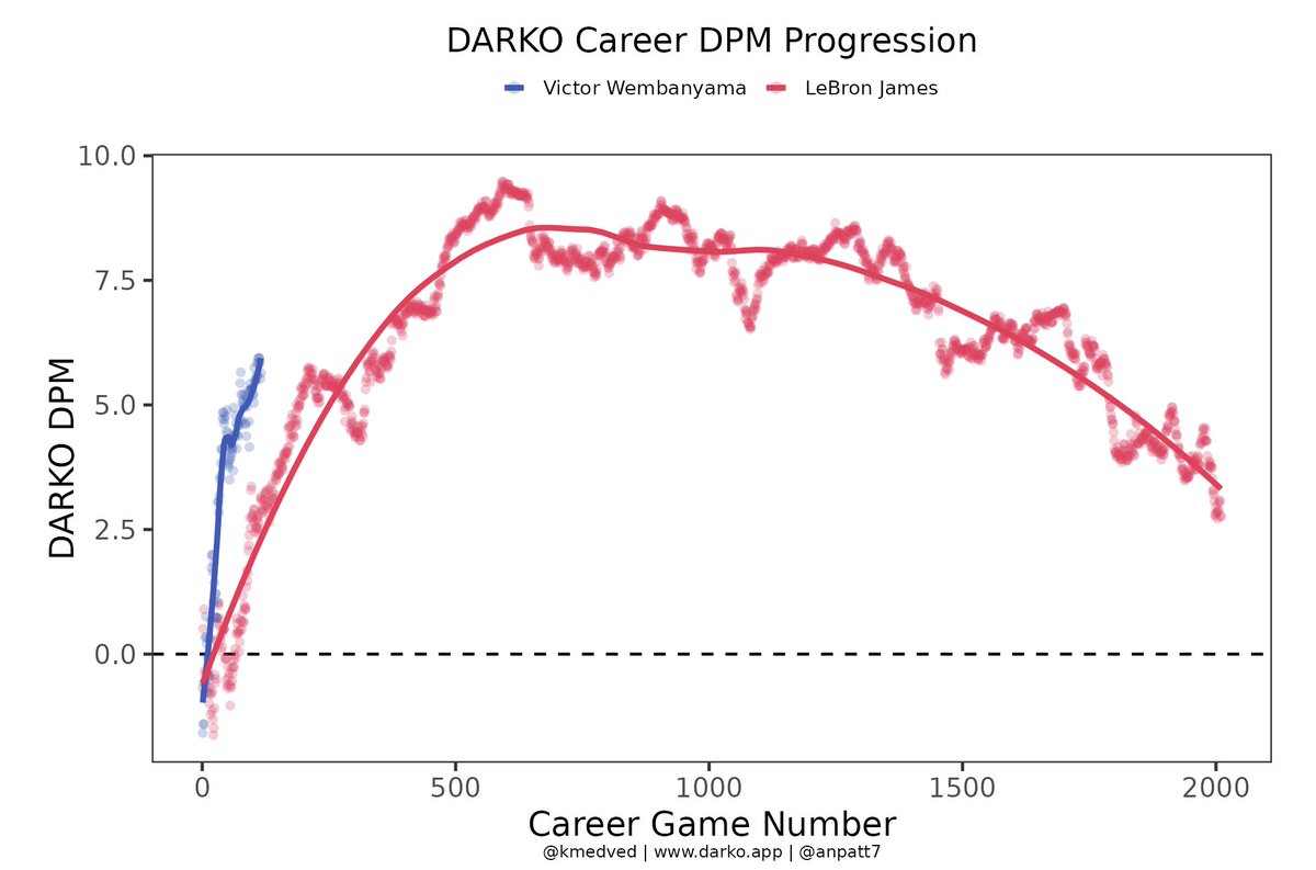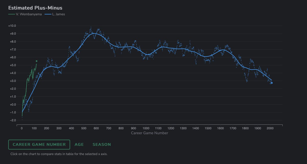 Pick whatever metric you want: Wemby’s aging curve to start his career is hilarious- just a straight line upwards. pic.twitter.com/syQTR79zxf