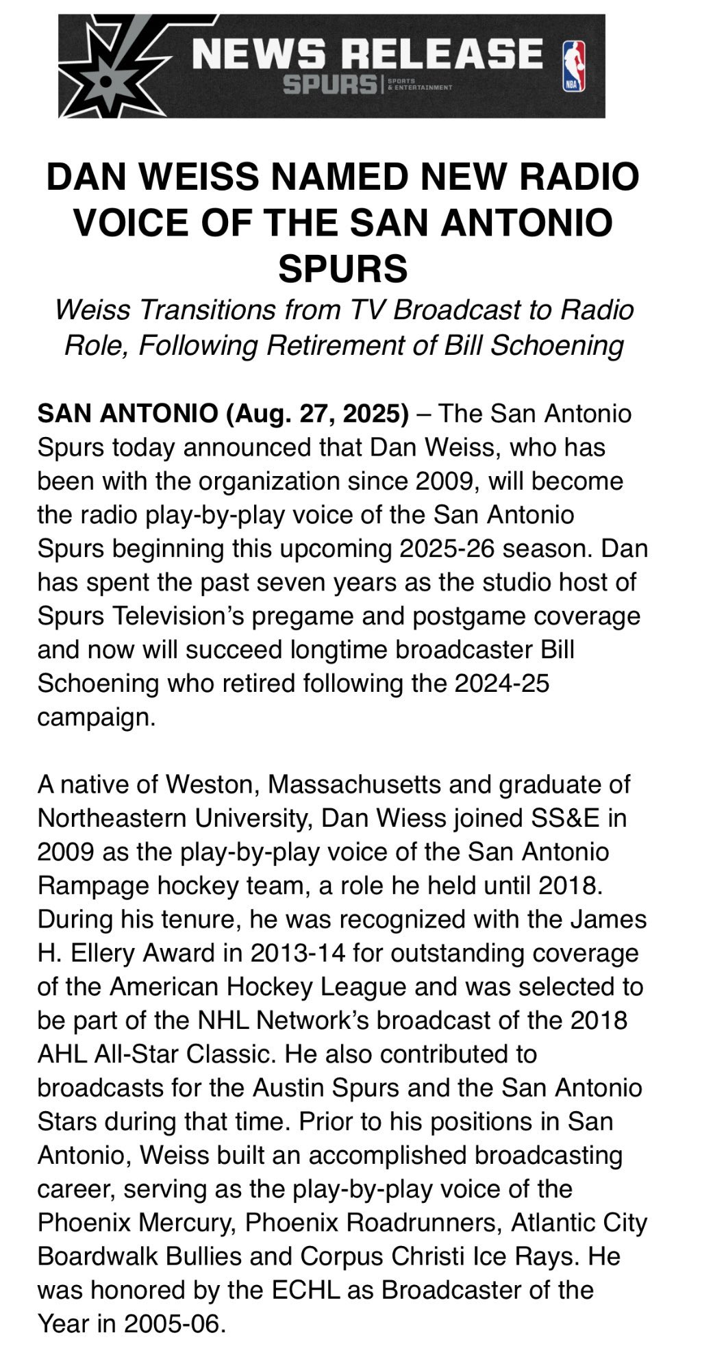 The San Antonio Spurs today announced that Dan Weiss, who has been with the organization since 2009, will become the radio play-by-play voice of the San Antonio Spurs beginning this upcoming 2025-26 season. Dan has spent the past seven years as the studio host of Spurs Television’s pregame and postgame coverage and now will succeed longtime broadcaster Bill Schoening who retired following the 2024-25 campaign.