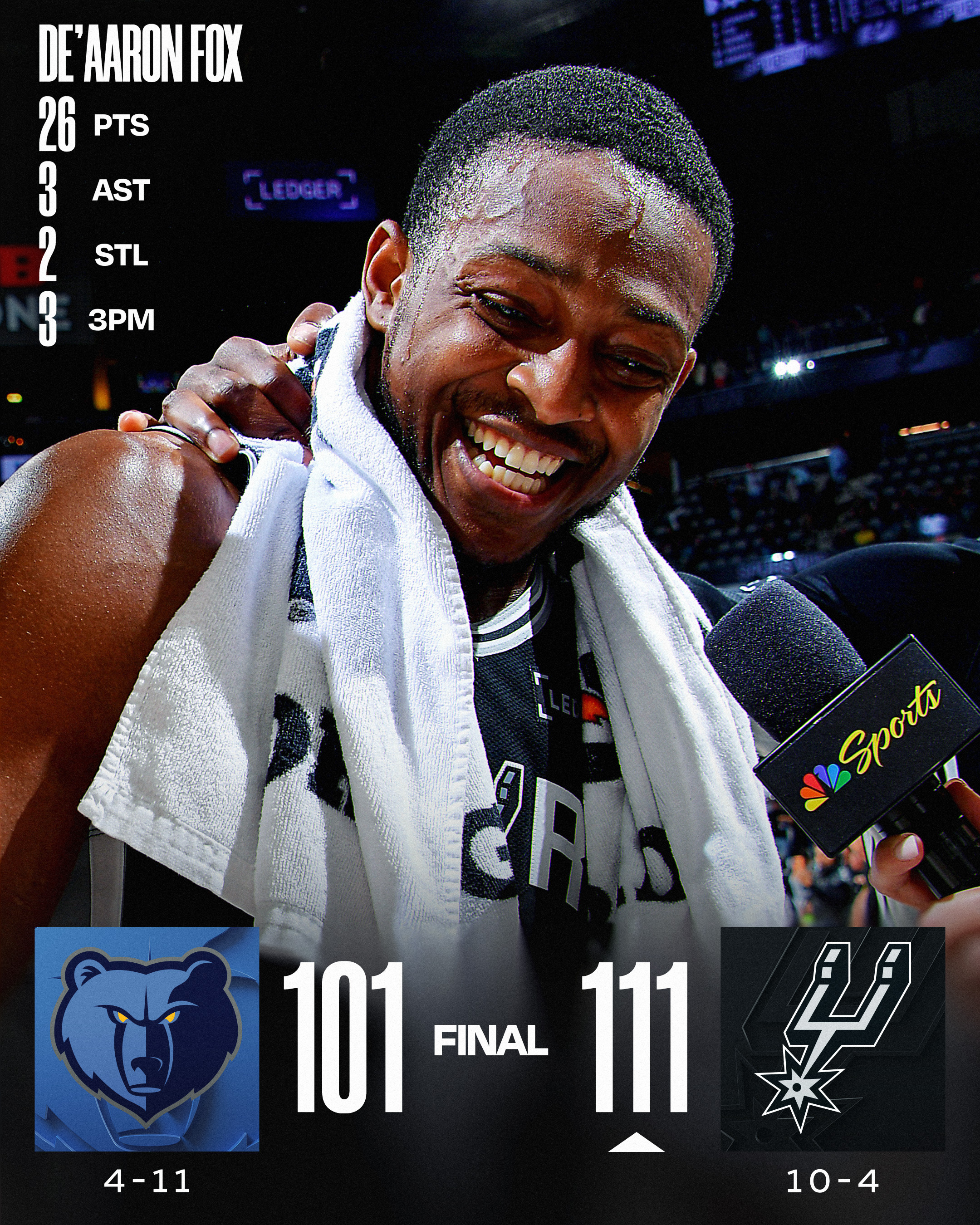 Sending everyone out on a reminder that these (our) Spurs will have to remain vigilant in a season sure to have challenges, injuries, and the ball bouncing the other way. But 10 wins through the first 14 games is nothing to scoff at. Onto the next!