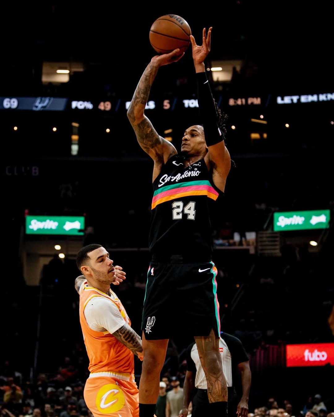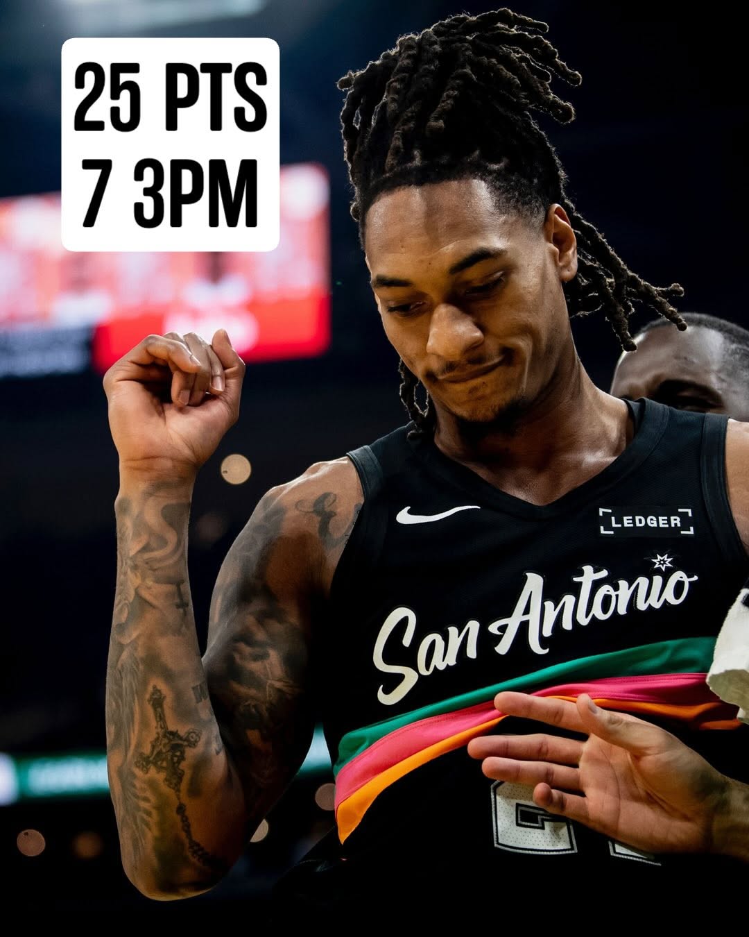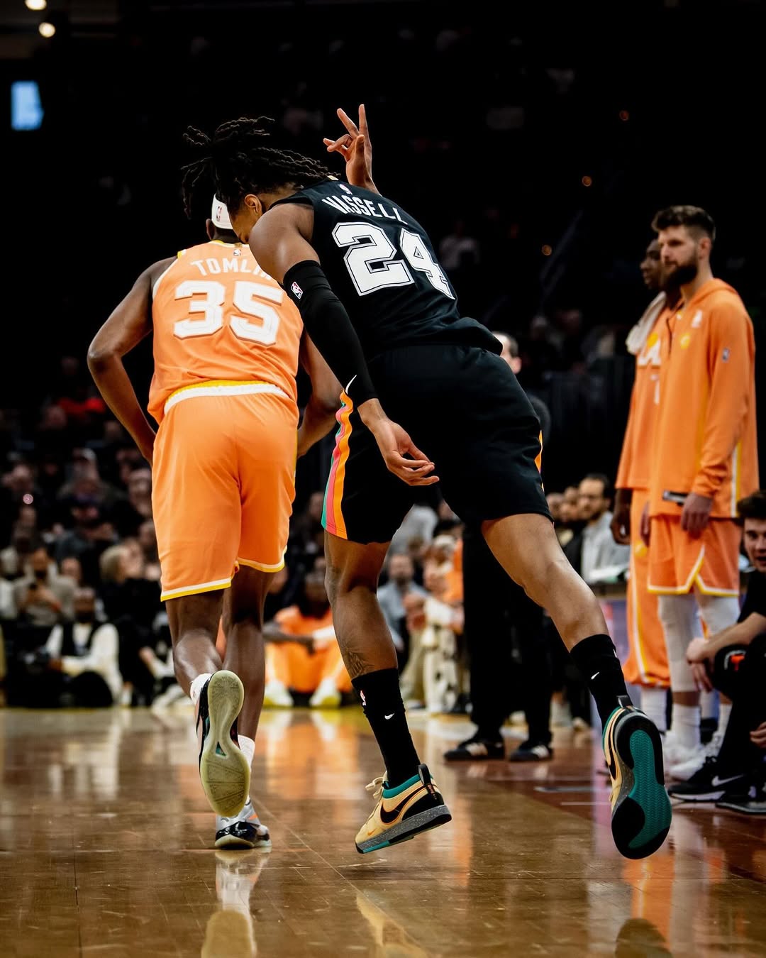 Vassell’s first-half eruption was a sight to behold. He went 7-for-10 from the 3-point stripe, matching Bryn Forbes’ franchise record for 3-pointers in a half.