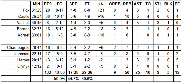 巴恩斯上半场的进攻输出至关重要。他在半场结束前得到13分,大部分伤害来自三分线外。只要看到篮筐,巴恩斯就果断出手——这帮助球队拉开了场上空间。下半场他手感有所冷却,但在攻防两端依然是一位值得信赖的外线球员。