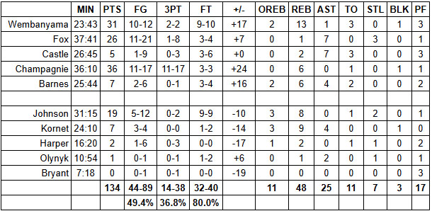 这是一场令人印象深刻的执教表现。在文班亚马倒下后,马刺本可能就此缴械投降。然而,圣安东尼奥队奋起反击,最终赢得了胜利。约翰逊的轮换非常明智——尤其是给予了尚帕尼、福克斯和约翰逊额外的出场时间。削减卡斯尔和哈珀的时间也是明智之举。除了尚帕尼核爆级的表现外,马刺在进攻端并无特别之处,但防守端的比赛计划成功地阻止了尼克斯找到持续稳定的节奏。
