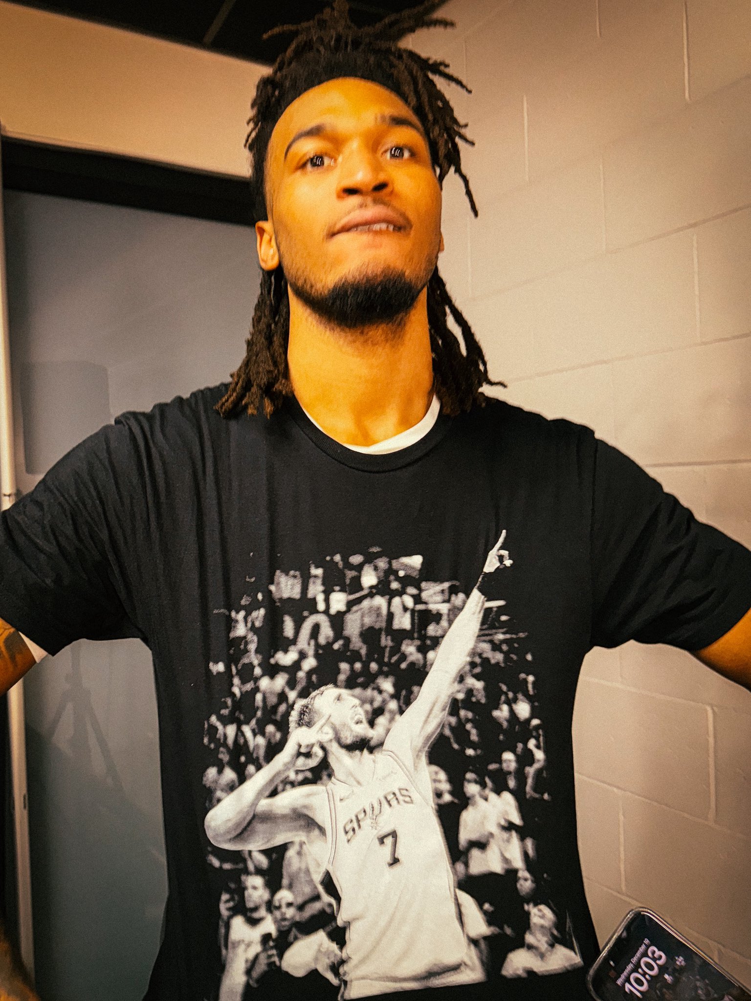 His new teammates are loving it just as much. That spectacle turned into a T-shirt that was distributed to the Spurs thanks to Mitch Johnson and equipment manager Cory Johnson, as players wore it out to their post-game press conferences after an NBA Cup win against the Los Angeles Lakers.