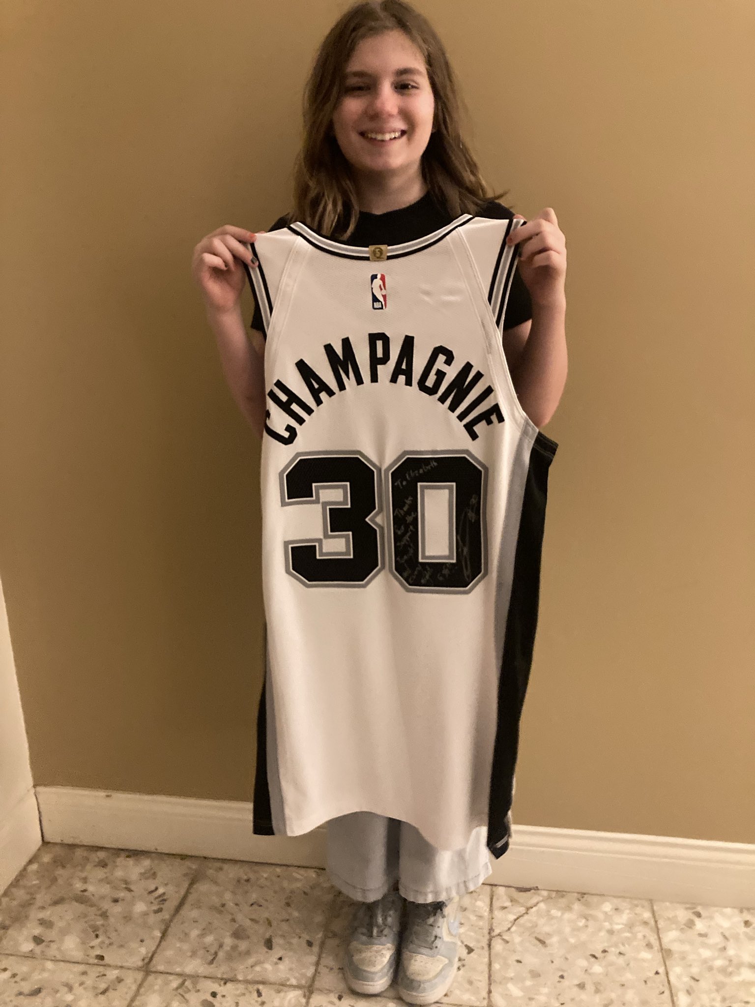After the game, he invited Elizabeth down to receive his game-worn jersey, which he’d signed. Due to timing — the Spurs were heading out immediately after to make the trip to Houston for the second night of a back-to-back — he wasn’t able to deliver it personally, but we got to thank the crew who she’d been with for both shoot around distributions.