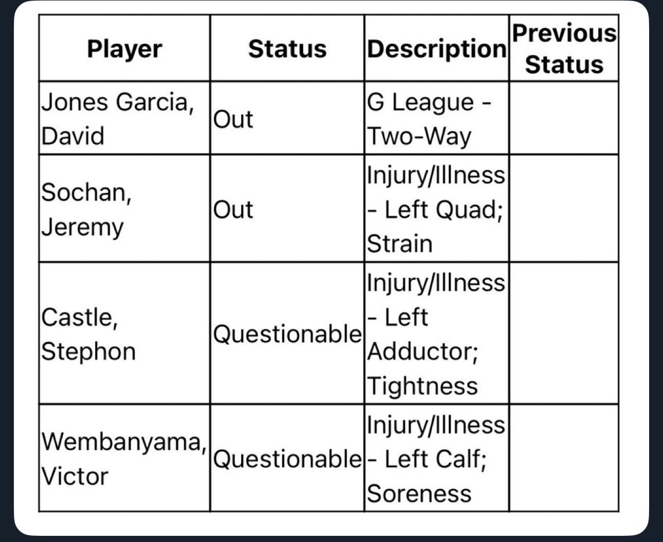 Victor Wembanyama and Stephon Castle are now both listed as questionable as well