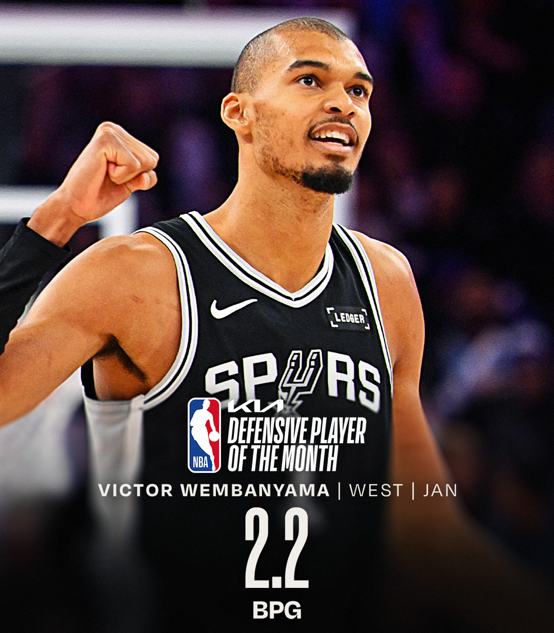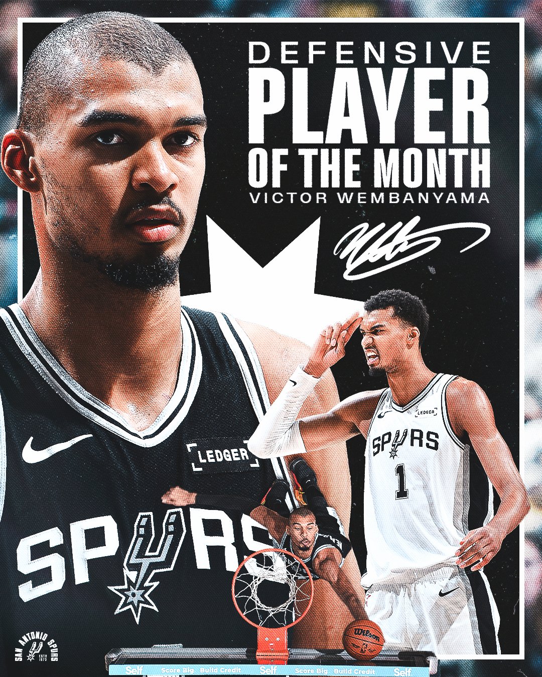 恭喜维克托·文班亚马 (Victor Wembanyama) 当选NBA西部月度最佳防守球员 ![]()