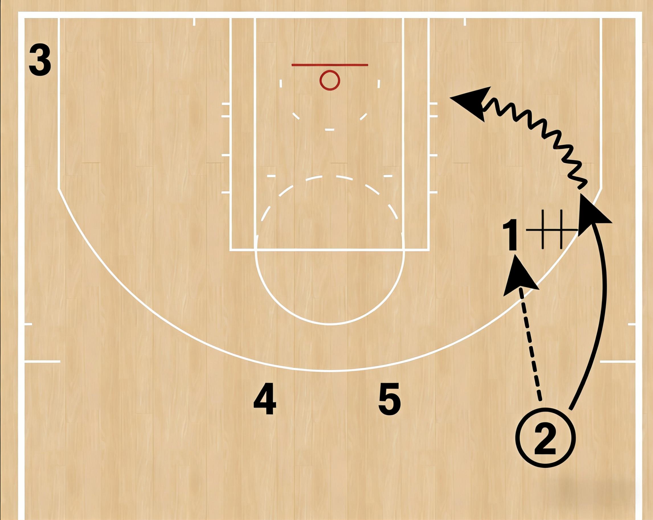 持球人将球传给翼侧(45度位置)的2号位队友后,加速上前与之进行手递手配合,突破上篮完成得分。