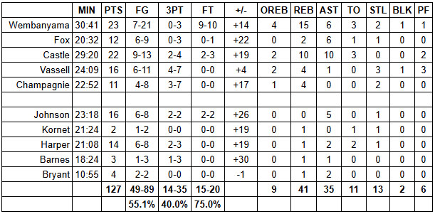 The good: Wembanyama had some of his best passes of the season against the Bucks. His rebounding was exceptional. He defended well in all aspects. Offensively, his relentless aggression led to 10 free throw attempts. The bad: With the game basically settled early on, Wembanyama didn’t get many serious field goal attempts. The result was a 7-for-21 showing from the floor, including an 0-for-3 display from downtown.